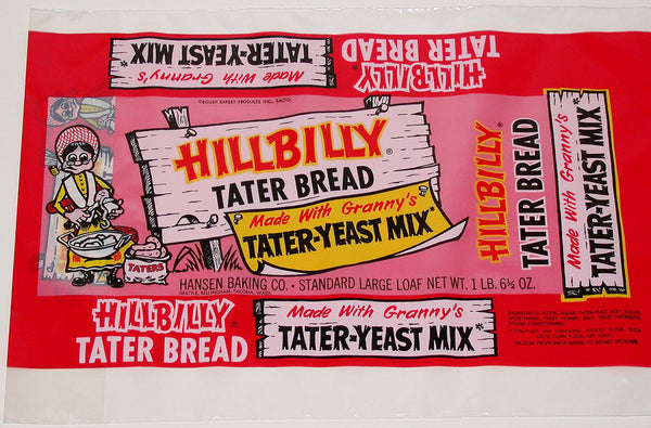 Vintage product advertising bag, HILLBILLY TATER BREAD copyright Roush Bakery Products Inc. Sacto. Hansen Baking Co. Seattle Bellingham Tacoma Wash., picturing a cartoon hillbilly grandma peeling potatoes, in n-mint unused new old stock condition. Few wrinkles from storage. Size is 9 1/2" x 19". NOTE: All of the bags I have listed are guaranteed to be 100% authentic originals. They are all unused and new old stock unless otherwise noted. Thank you for your purchase I appreciate it.