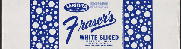 Vintage bread wrapper, FRASER'S WHITE SLICED Fraser's Bakery Kelso Wash., in n-mint unused new old stock condition. Few light wrinkles. Size is appx. 17 1/2" x 25 1/2". NOTE: All of the bread wrappers I have listed are guaranteed to be 100% authentic and come from original factory rolls. They are made of waxed paper and will be large enough to wrap up for display or frame. They may have bumping/small tears/spotting to the edges. Thank you for your purchase, I appreciate it.