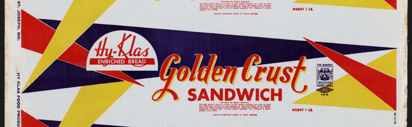 Vintage bread wrapper, HY-KLAS GOLDEN CRUST Sandwich Hy Klas Food Products Inc. St. Joseph MO. dated 1956, has the Union Made logo, in excellent+ unused new old stock condition. Few wrinkles and some splits/bumps/spotting at the edges. Size is 15 5/8" x 20". The black border is so all the edge can be seen and is not part of the bread wrapper itself. NOTE: All of the bread wrappers I have listed are guaranteed to be 100% authentic and come from original factory rolls. They are made of waxed paper and will be large enough to wrap up for display or frame. They may have bumping/small tears/spotting to the edges. Thank you for your purchase, I appreciate it.