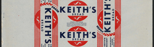 Vintage bread wrapper, KEITH'S BREAD Keith's Bakery Charlestown Illinois, in excellent++ unused new old stock condition. Few wrinkles and some spots. Size is appx. 19" x 19 1/2". NOTE: All of the bread wrappers I have listed are guaranteed to be 100% authentic and come from original factory rolls. They are made of waxed paper and will be large enough to wrap up for display or frame. They may have bumping/small tears/spotting to the edges. Thank you for your purchase, I appreciate it.