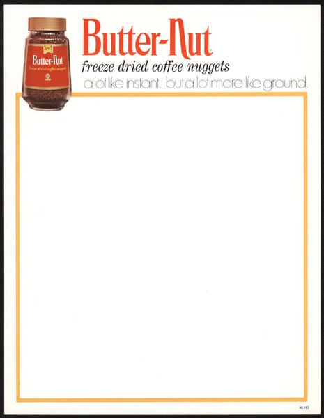 Vintage letterhead, BUTTER-NUT Freeze Dried Coffee Nuggets, picturing the jar, in n-mint+ unused new old stock condition. Nice clean letterhead. Scans show the whole letterhead and a close up of the advertising. Size is 8 1/2" x 11". The black border is so all the edges can be seen and is not part of the letterhead itself. NOTE: The advertising letterheads I have listed are guaranteed to be 100% authentic originals. They are all clean, unused and new old stock unless otherwise noted. Thank you for your purchase I appreciate it.