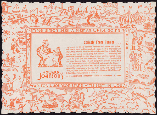 Vintage paper placemat, HOWARD JOHNSON'S, picturing cartoon graphics Should Simple Simon Seek a Pieman while going to the fair, in n-mint condition. Has a light vertical center fold. Size is 9 1/4" x 12 3/4". Scans show the front, back is blank. The black border is so all the edges can be seen and is not part of the placemat itself. NOTE: All of the paper placemats I have listed come from my personal collection and most date from the 1940's and 1950's. Many are Rare and come from places long since out of business. They are all guaranteed to be 100% authentic originals. These look great framed. Thank you for your purchase, I appreciate it.