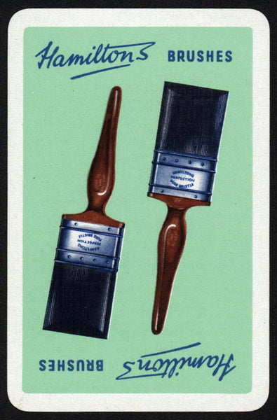 Vintage single playing card, HAMILTON'S BRUSHES green background (not marked but this is from Bromsgrove England), picturing the Perfection Pure Bristle brushes. See scans for details on the condition. The black border is so all the edges can be seen and is not part of the playing card itself. NOTE: All of the playing cards I have listed are guaranteed to be 100% authentic originals. You will receive a random card from the deck with the advertising shown in the listing. Cards are generally clean but there may be some spots/scuffs or age toning. If you need specific details on the condition, ask before making the purchase. Thank you for your purchase, I appreciate it.