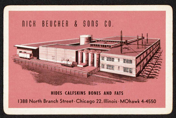 Vintage single playing card, NICK BEUCHER & SONS CO. pink background Hides Calfskins Bones and Fats Chicago Illinois, picturing their plant. See scans for details on the condition. Few spots and some age toning. The black border is so all the edges can be seen and is not part of the playing card itself. NOTE: All of the playing cards I have listed are guaranteed to be 100% authentic originals. You will receive a random card from the deck with the advertising shown in the listing. Cards are generally clean but there may be some spots/scuffs or age toning. If you need specific details on the condition, ask before making the purchase. Thank you for your purchase, I appreciate it.