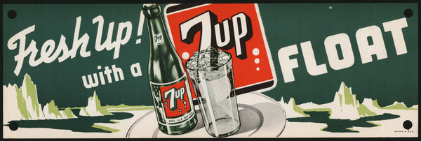 Vintage soda pop paper sign, 7 UP Fresh Up! with a 7Up Float, picturing the bubble girl bottle, in n-mint unused new old stock condition. Couple of spots/bumps. Size is 5 1/2" x 16 5/8". Scans show the front, back is blank. The black border is so all the edges can be seen and is not part of the sign itself. NOTE: All of the advertising items I have listed are guaranteed to be 100% authentic originals. They are all clean and ready for display. Thank you for your purchase I appreciate it.