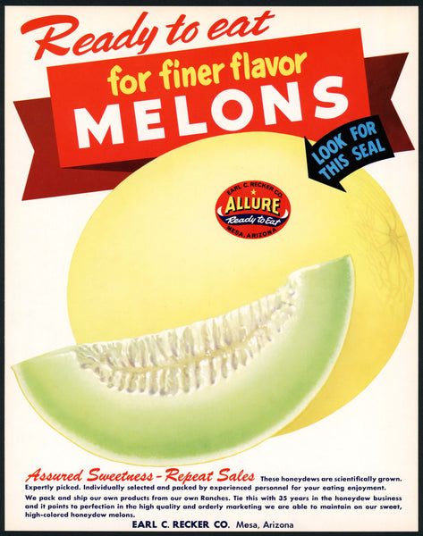 Vintage cardboard sign, ALLURE MELONS Earl C. Recker Co. Mesa Arizona, melon and slice pictured, in n-mint unused new old stock condition. Bit of age toning at the edges. Size is 11" x 14". The black border is so all the edges can be seen and is not part of the sign itself. NOTE: All of the advertising items I have listed are guaranteed to be 100% authentic originals. They are all clean and ready for display. Thank you for your purchase I appreciate it.