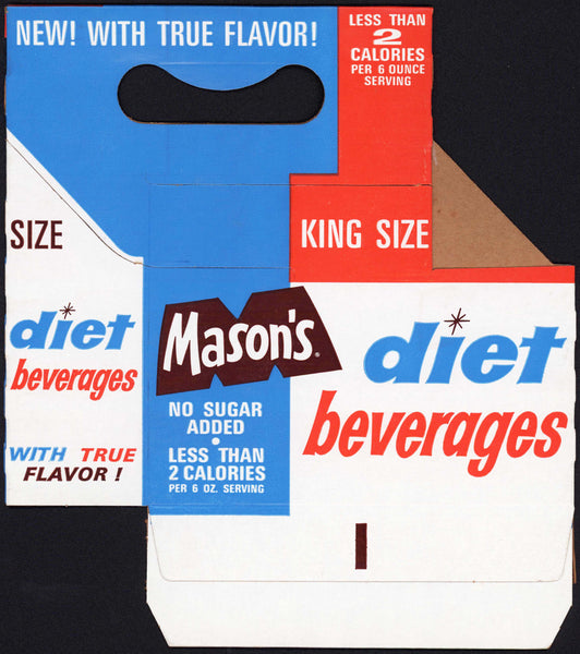 Vintage soda pop bottle 6-pack carton, MASON'S DIET BEVERAGES, 10oz size, unused new old stock. See pictures and scans for details on condition. NOTE: All of the soda pop bottle cartons I have listed are guaranteed to be 100% authentic originals. They are all clean and ready for display. The one you will receive will be flat, not folded up, unless otherwise noted. Thank you for your purchase, I appreciate it.