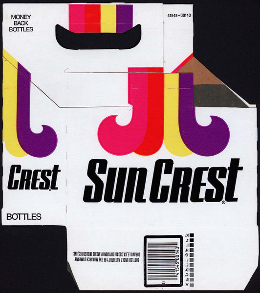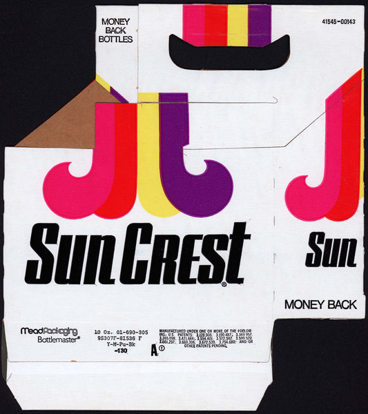 Vintage soda pop bottle 6-pack carton, SUN CREST, 10oz size "Money Back Bottles", unused new old stock. See pictures and scans for details on condition. NOTE: All of the soda pop bottle cartons I have listed are guaranteed to be 100% authentic originals. They are all clean and ready for display. The one you will receive will be flat, not folded up, unless otherwise noted. Thank you for your purchase, I appreciate it.