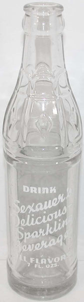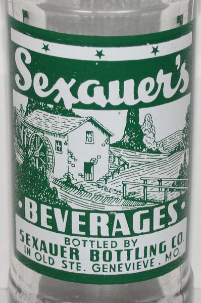 Vintage soda pop bottle, SEXAUER'S BEVERAGES Sexauer Bottling Co. in Old Ste. Genevieve MO. dated 1947, 7oz size picturing an old gristmill scene, in excellent++ condition. Rare bottle. Has some scuffs in the glass, label is nice. No chips or cracks. Pictures show 3 views. NOTE: All of the advertising items I have listed are guaranteed to be 100% authentic originals. They are all clean and ready for display. Thank you for your purchase, I appreciate it.