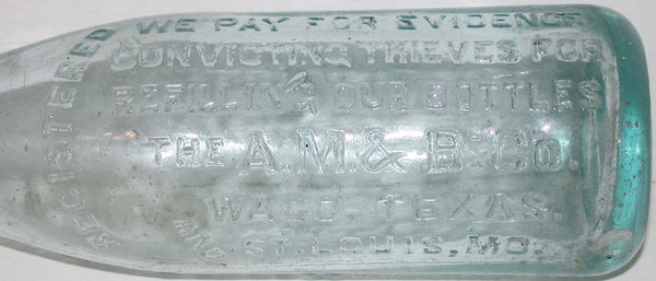 Vintage soda pop bottle, THE A.M. & B. Co. Waco Texas and St. Louis MO. (referred to as the Dr Pepper thieves bottle), embossed ice blue "We Pay For Evidence Convicting Thieves For Refilling Our Bottle", in excellent condition. Has some scuffing/tics with a small bruise around the base and 2 tiny flea bite chips on the outer lip. Overall displays nice. No cracks. Pictures show 2 views. NOTE: All of the advertising items I have listed are guaranteed to be 100% authentic originals. They are all clean and ready for display. Thank you for your purchase, I appreciate it.