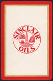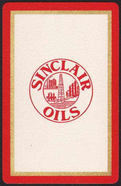 Vintage single swap playing card, SINCLAIR OILS red border, picturing an oil derrick and refinery. See scans for details on the condition. The black border is so all the edges can be seen and is not part of the playing card itself. NOTE: All of the playing cards I have listed are guaranteed to be 100% authentic originals. You will receive a random card from the deck with the advertising shown in the listing. Cards are generally clean but there may be some spots/scuffs or age toning. If you need specific details on the condition, ask before making the purchase. Thank you for your purchase, I appreciate it.