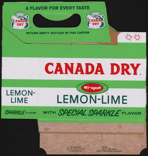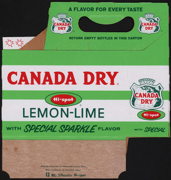 Vintage soda pop bottle 6-pack carton, CANADA DRY HI-SPOT LEMON-LIME, 12oz size "With Special Sparkle Flavor", unused new old stock. See pictures and scans for details on condition. NOTE: All of the soda pop bottle cartons I have listed are guaranteed to be 100% authentic originals. They are all clean and ready for display. The one you will receive will be flat, not folded up, unless otherwise noted. Thank you for your purchase, I appreciate it.
