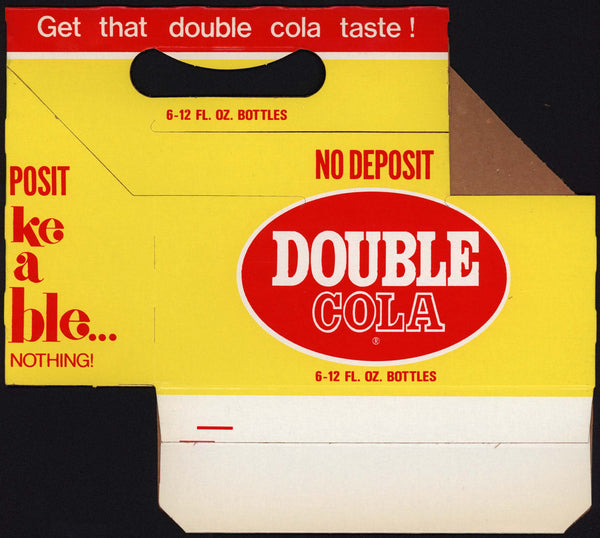 Vintage soda pop bottle 6-pack carton, DOUBLE COLA "make it a Double... or Nothing!" slogan, 12oz size No Deposit, unused new old stock. See pictures and scans for details on condition. NOTE: All of the soda pop bottle cartons I have listed are guaranteed to be 100% authentic originals. They are all clean and ready for display. The one you will receive will be flat, not folded up, unless otherwise noted. Thank you for your purchase, I appreciate it.