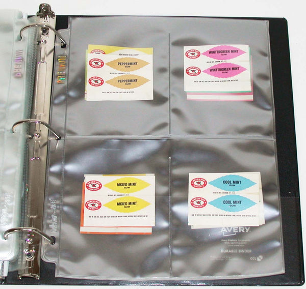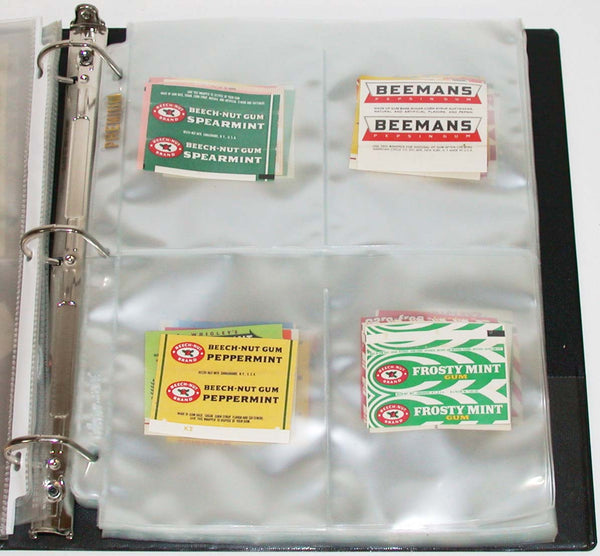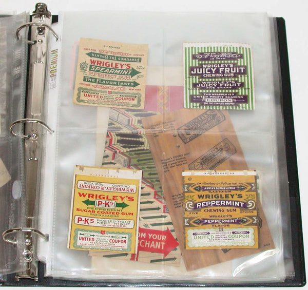 Vintage GUM and CANDY WRAPPER COLLECTION, 107 all different originals, there are 99 gum wrappers 6 candy wrappers and 2 Wrigley's advertisers. Collection is in a d-ring view binder and archival pages. Condition ranges from v-good to n-mint condition. Few spots/bumps/folds/wrinkles on some. Sizes vary. Overall a great instant collection. Pictures show several pages in this collection. You get all 107 for one price. NOTE: All of the wrappers in this collection are guaranteed to be 100% authentic originals. Thank you for your purchase, I appreciate it.