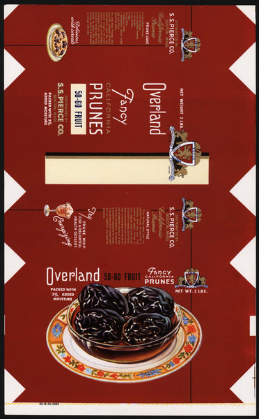 Vintage box wrapper OVERLAND PRUNES pictured S S Pierce Boston Mass unused n-mint
