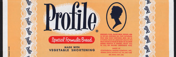 Vintage bread wrapper, PROFILE SPECIAL FORMULA BREAD Continental Baking Company Inc. Rye New York dated 1955, picturing a woman cameo, in n-mint unused new old stock condition. Few wrinkles. Size is appx. 13" x 22 3/8". The black border is so all the edge can be seen and is not part of the bread wrapper itself. NOTE: All of the bread wrappers I have listed are guaranteed to be 100% authentic and come from original factory rolls. They are made of waxed paper and will be large enough to wrap up for display or frame. They may have bumping/small tears/spotting to the edges. Thank you for your purchase, I appreciate it.