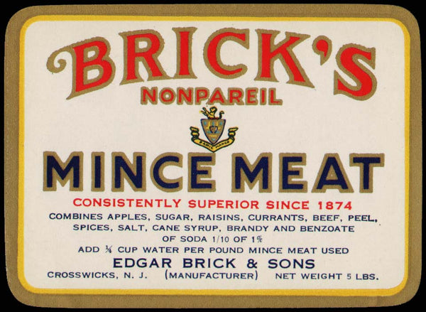 Vintage label, BRICK'S Nonpareil MINCE MEAT Edgar Brick & Sons Crosswicks N.J., 5lb size with a nice lion crest, in n-mint+ unused new old stock condition. Nice clean label. Size is 2 1/4" x 3 1/8". Scans show the front, back is blank. The black border is so all the edges can be seen and is not part of the label itself. NOTE: All of the advertising labels I have listed are guaranteed to be 100% authentic originals. They are all clean, unused and new old stock unless otherwise noted. Thank you for your purchase I appreciate it.