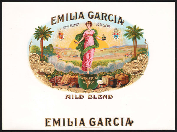 Vintage label, EMILIA GARCIA Mild Blend cigar box inner, embossed picturing a woman, in n-mint+ unused new old stock condition. Nice clean label. Size is 7" x 9 3/8". Scans show the front, back is blank. The black border is so all the edges can be seen and is not part of the label itself. NOTE: All of the advertising labels I have listed are guaranteed to be 100% authentic originals. They are all clean, unused and new old stock unless otherwise noted. Thank you for your purchase I appreciate it.