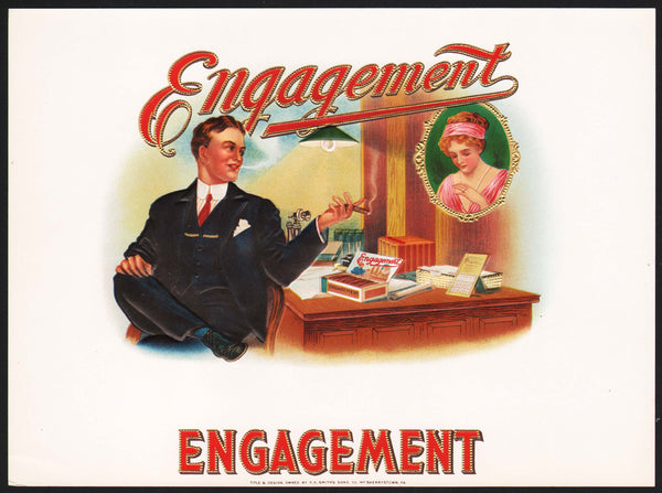 Vintage label, ENGAGEMENT cigar box inner, embossed picturing a man at his desk and a woman, in n-mint+ unused new old stock condition. Nice clean label. Size is 7" x 9 1/2". Scans show the front, back is blank. The black border is so all the edges can be seen and is not part of the label itself. NOTE: All of the advertising labels I have listed are guaranteed to be 100% authentic originals. They are all clean, unused and new old stock unless otherwise noted. Thank you for your purchase I appreciate it.
