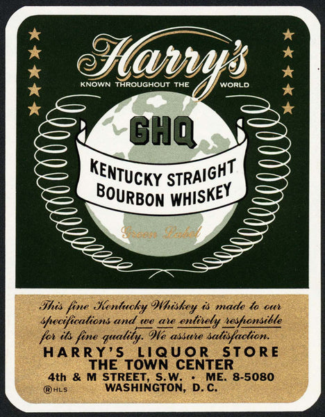 Vintage label, HARRY'S GHQ Kentucky Straight Bourbon Whiskey Harry's Liquor Store The Town Center Washington D.C., picturing a globe and stars, in n-mint+ unused new old stock condition. Nice clean label. Size is 4 1/2" x 5 3/4". Scans show the front, back is blank. The black border is so all the edges can be seen and is not part of the label itself. NOTE: All of the advertising labels I have listed are guaranteed to be 100% authentic originals. They are all clean, unused and new old stock unless otherwise noted. Thank you for your purchase I appreciate it.
