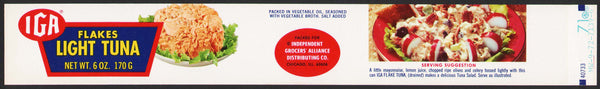 Vintage label, IGA Flakes Light Tuna Independent Grocers Alliance Distributing Co. Chicago ILL., 6oz size picturing tuna with a Serving Suggestion, in n-mint+ unused new old stock condition. Nice clean label. Size is 1 1/2" x 11". Scans show the front, back is blank. The black border is so all the edges can be seen and is not part of the label itself. NOTE: All of the advertising labels I have listed are guaranteed to be 100% authentic originals. They are all clean, unused and new old stock unless otherwise noted. Thank you for your purchase I appreciate it.