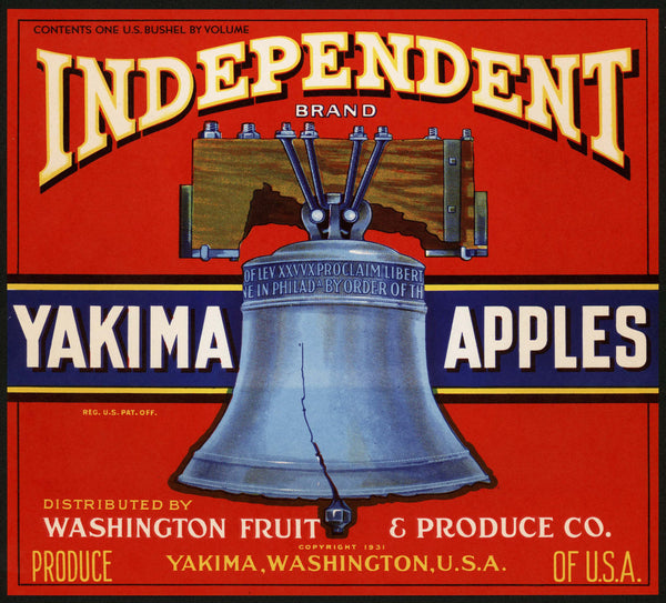 Vintage label, INDEPENDENT BRAND Yakima Apples fruit crate Washington Fruit & Produce Co. Yakima Washington copyright 1931, One U.S. Buschel size picturing the Liberty Bell, in n-mint+ unused new old stock condition. Nice clean label. Size is 9" x 10". Scans show the front, back is blank. The black border is so all the edges can be seen and is not part of the label itself. NOTE: All of the advertising labels I have listed are guaranteed to be 100% authentic originals. They are all clean, unused and new old stock unless otherwise noted. Thank you for your purchase I appreciate it.