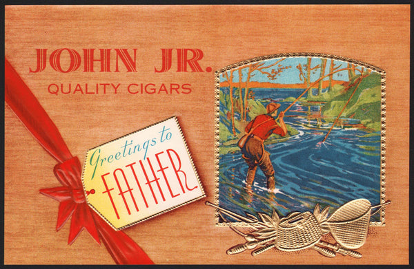Vintage label, JOHN JR. cigar box inner, embossed picturing a man fishing Greetings to Father, in n-mint+ unused new old stock condition. Nice clean label. Size is 5 1/2" x 8 5/8". Scans show the front, back is blank. The black border is so all the edges can be seen and is not part of the label itself. NOTE: All of the advertising labels I have listed are guaranteed to be 100% authentic originals. They are all clean, unused and new old stock unless otherwise noted. Thank you for your purchase I appreciate it.
