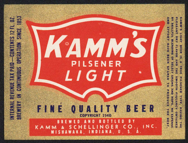 Vintage label KAMMS PILSNER LIGHT Beer IRTP Kamm Schellinger Mishawaka Indiana