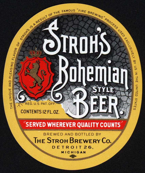Vintage label STROHS BOHEMIAN BEER The Stroh Brewery Detroit oval shaped n-mint+