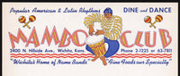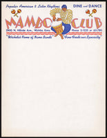 Vintage letterhead, MAMBO CLUB Dine and Dance Popular American & Latin Rhythms Wichita Kans, full color picturing a Latin drum player, in n-mint+ unused new old stock condition. Nice clean letterhead. Scans show the whole letterhead and a close up of the advertising. Size is 8 3/8" x 10 7/8". The black border is so all the edges can be seen and is not part of the letterhead itself. NOTE: The advertising letterheads I have listed are guaranteed to be 100% authentic originals. They are all clean, unused and new old stock unless otherwise noted. Thank you for your purchase I appreciate it.