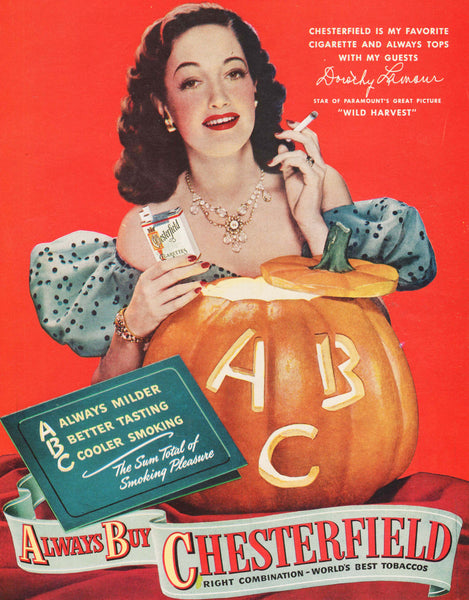 Vintage magazine ad, ABC CHESTERFIELD cigarettes from 1947, picturing Dorothy Lamour star of Wild Harvest. Ad may show minor imperfections consistent with age. Size is 10 1/4" x 13 3/4". Scans show the whole ad and a close up. The black border is so all the edges can be seen and is not part of the ad itself. NOTE: All of the magazine ads I have listed are guaranteed to be 100% authentic originals and come from my personal collection. They have been carefully removed from the magazine and kept in archival storage. Some are rare or very hard to find. Thank you for your purchase, I appreciate it.