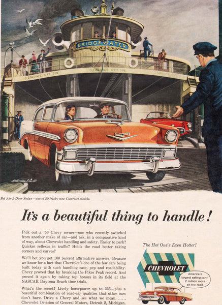 Vintage magazine ad, CHEVROLET BEL AIR 2-door sedan from 1956, Melbourne Brindle artwork of car driving off of Bridgewater ferry boat. Ad may show minor imperfections consistent with age. Size is 9 1/2" x 12 1/2".Scans show the whole ad and a close up. The black border is so all the edges can be seen and is not part of the ad itself. NOTE: All of the magazine ads I have listed are guaranteed to be 100% authentic originals and come from my personal collection. They have been carefully removed from the magazine and kept in archival storage. Some are rare or very hard to find. Thank you for your purchase, I appreciate it.