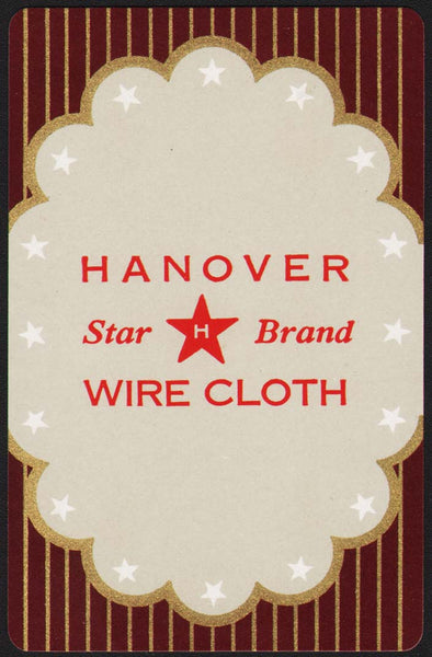 Vintage single swap playing card, HANOVER WIRE CLOTH maroon background Star Brand (not marked but this is from Hanover Pennsylvania). See scans for details on the condition. The black border is so all the edges can be seen and is not part of the playing card itself. NOTE: All of the playing cards I have listed are guaranteed to be 100% authentic originals. You will receive a random card from the deck with the advertising shown in the listing. Cards are generally clean but there may be some spots/scuffs or age toning. If you need specific details on the condition, ask before making the purchase. Thank you for your purchase, I appreciate it.