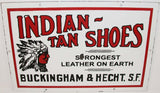 Vintage porcelain sign, INDIAN TAN SHOES Buckingham & Hecht S.F. (San Francisco California), picturing an indian "Strongest Leather On Earth", in excellent++ condition. Rare sign and guaranteed to be an original. Has a few minor edge chips, and one ding on the t in Strongest. Size is 12" x 18". Pictures show front and back. NOTE: I recently acquired a large collection of over 200 vintage original advertising signs, clocks and thermometers which I will be selling off over the next year or two. Many of them have an indian motif with great graphics. Some are very rare and the majority are in top condition. They are all clean and ready for display. Thank you for your purchase, I appreciate it.