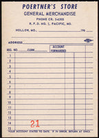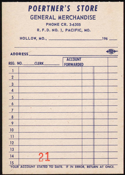 Vintage receipt, POERTNER'S STORE General Merchandise Pacific MO. Hollow MO dated 1960s, in n-mint+ unused new old stock condition. Nice clean receipt. Size is 3 3/8" x 4 3/4". Scans show the front, back is blank. The black border is so all the edges can be seen and is not part of the receipt itself. NOTE: All of the receipts I have listed are guaranteed to be 100% authentic originals. They are all clean, unused and new old stock unless otherwise noted. Thank you for your purchase, I appreciate it.