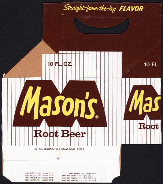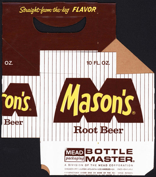 Vintage soda pop bottle 6-pack carton, MASON'S ROOT BEER, 10oz size, unused new old stock. See pictures and scans for details on condition. NOTE: All of the soda pop bottle cartons I have listed are guaranteed to be 100% authentic originals. They are all clean and ready for display. The one you will receive will be flat, not folded up, unless otherwise noted. Thank you for your purchase, I appreciate it.