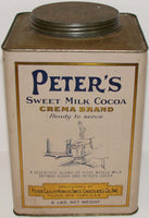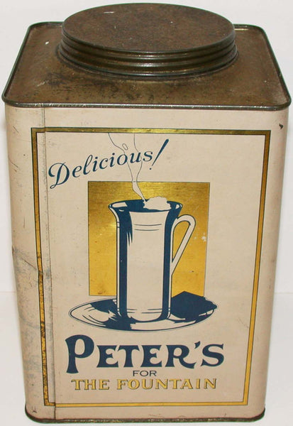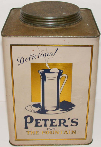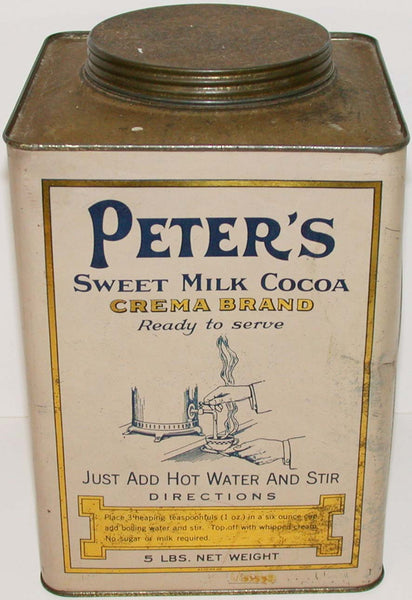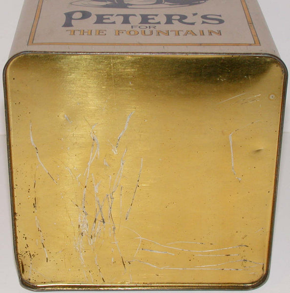 Vintage tin, PETER'S SWEET MILK COCOA Crema Brand for The Fountain Peter Cailler Kohler Swiss Chocolates Co. Inc. Fulton New York, 5lbs size picturing a glass and a dispenser with the correct original lid, in excellent+ condition. Rare tin. Has some scuffs/spots and a small dent in one corner. Overall displays great. Size is 9" x 6" x 6". Pictures show 7 views. NOTE: All of the advertising items I have listed are guaranteed to be 100% authentic originals. They are all clean and ready for display. Thank you for your purchase, I appreciate it.