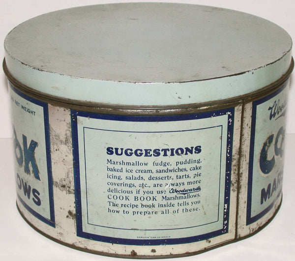Vintage tin, WOODWARD'S COOK BOOK MARSHMALLOWS John G. Woodward & Co. Council Bluffs Iowa, large 5lbs size with the correct original lid, in excellent condition. Rare tin in this size. Has some scuffs/spots and a shallow indent around the bottom rim with a few on the lid. Overall displays great. Empty. Size is 6" tall by 10" in diameter. Pictures show 4 views. NOTE: All of the advertising items I have listed are guaranteed to be 100% authentic originals. They are all clean and ready for display. Thank you for your purchase, I appreciate it.